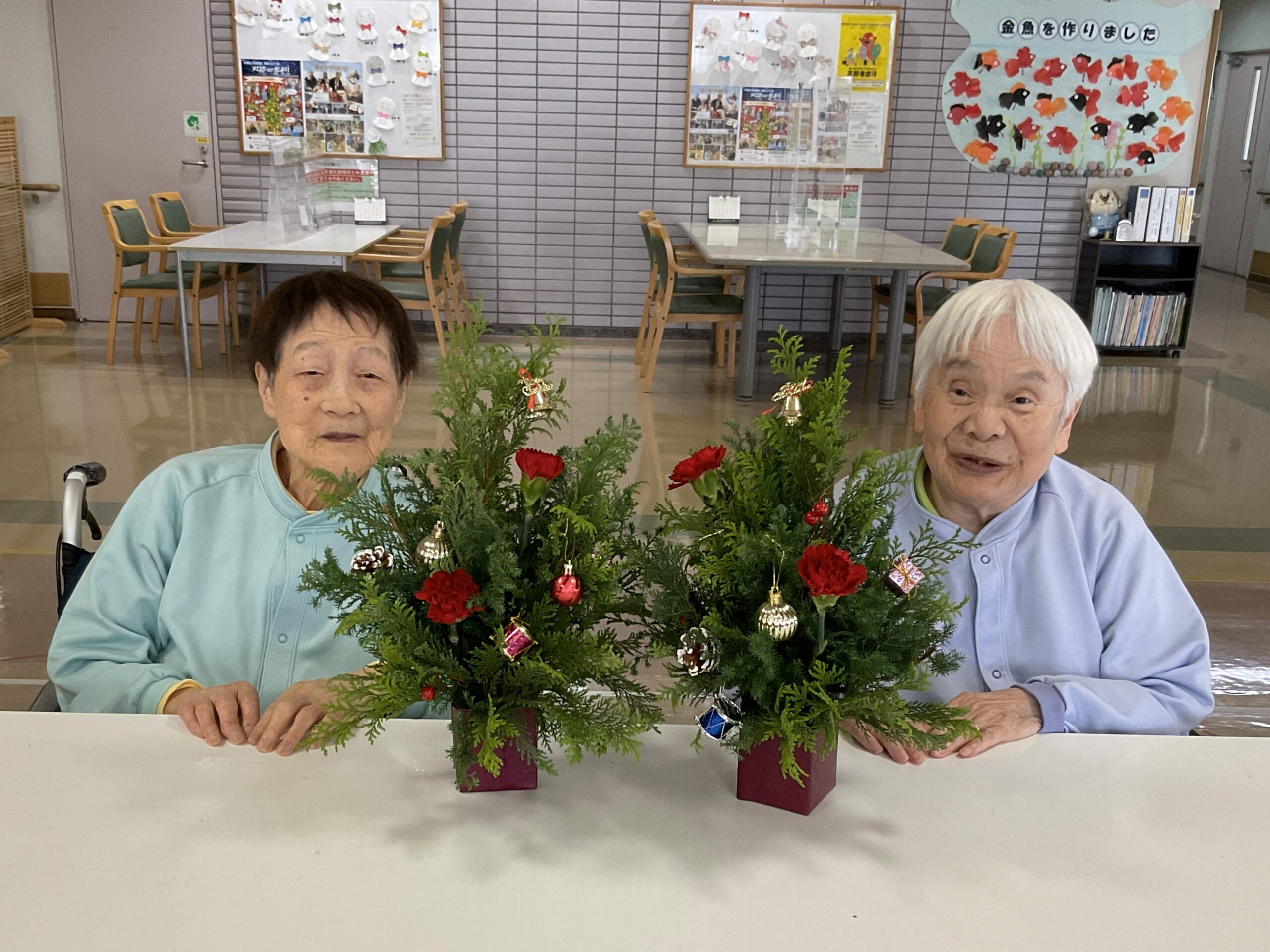 ツリーの三角形になるようにヒバと杉をバランスよく挿していくのがとても難しかったですが、オーナメントを飾ったりとってもクリスマスらしい素敵な作品が完成しました☆彡